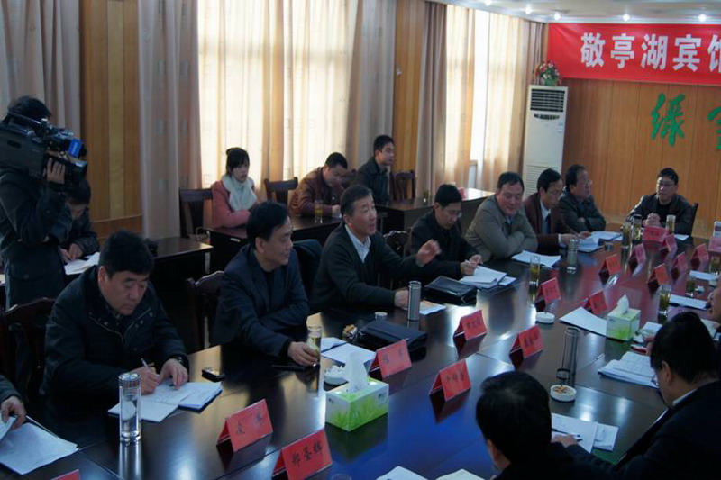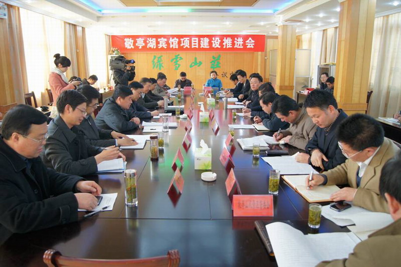 为扩大垦地合作成果,加快项目建设进度,314日下午,安徽农垦集团与宣城市人民政府在敬亭山茶场绿雪山庄联合召开了敬亭湖宾馆项目建设推进会。省农垦集团董事长田文俊、宣城市市长虞爱华出席会议。省农垦集团副总经理程军、陈仁虎以及省农垦皖南开发指挥部负责同志,宣城市政府秘书长牛传勇以及市直相关部门、宣州区政府主要负责人参加了会议。