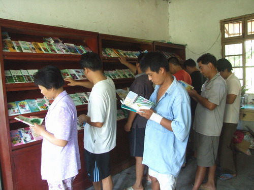 龙亢农场作为国家社会主义新农村建设的联系点,充分发挥科技带动作用,将农业部赠予的400册科技种、养殖图书摆上农场阅览室的书架上,并将科技实用书的目录印发给职工及周边的农民。图为职工和周边农民在借阅图书。