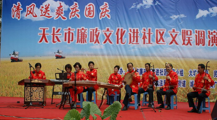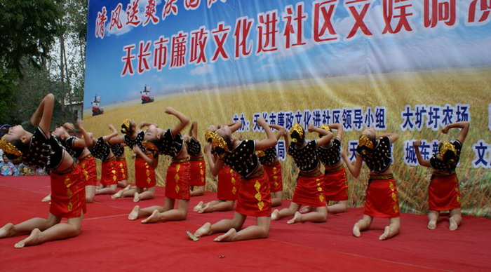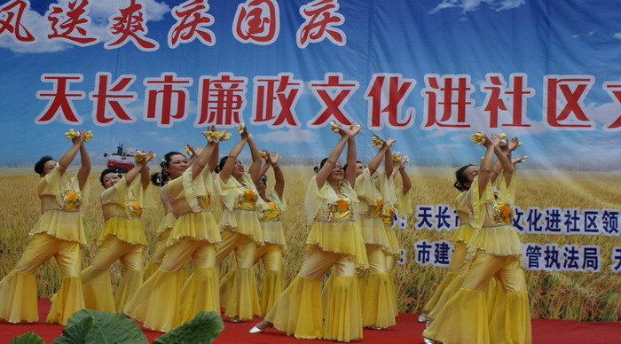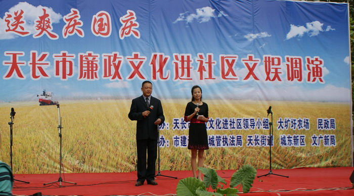 9月28日,安徽农垦大圹圩农场休闲广场欢歌笑语,人头攒动,热闹非凡。由天长市廉政文化进社区领导小组、大圹圩农场、天长市民政局联合主办,天长市相关部门协办的“清风送爽庆国庆——廉政文化进社区”文艺调演活动正在这里举行,热烈的气氛,精彩的节目,吸引了数百名群众观看。大圹圩农场场长汪登松、天长市廉政文化进社区领导小组负责人分别登台致辞。
