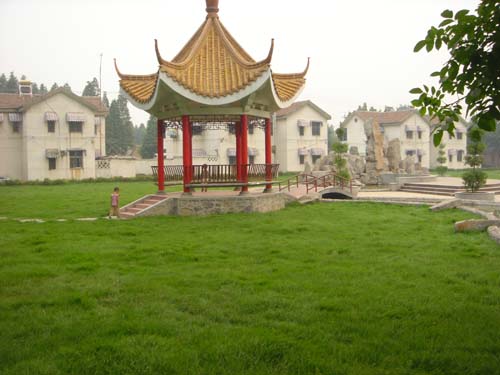 六月的砀山果园场一片碧绿,浓绿掩映下的休闲广场身姿丰润,仪态大方。亭台楼阁亭亭玉立,高雅端庄;小桥溪水,交相辉映,小桥精巧别致,溪水清澈见底,水底的鹅卵石栩栩如生;假山奇石嶙峋突兀,千姿百态;健身器错落有致,各式多样,鹅卵石铺设的小道在翠绿的草坪上弯曲回转,构成了一幅和谐优雅的风景图。