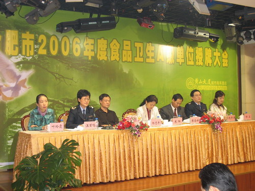 日前,合肥市卫生局组织人员对全市申报食品卫生信誉度A级单位进行了复核评审,经综合评定,安徽农垦黄山大厦等68家单位被评为2006年度合肥市食品卫生A级单位称号,黄山大厦郑群副总经理作为A级单位代表在会上发言。(图为会议现场)