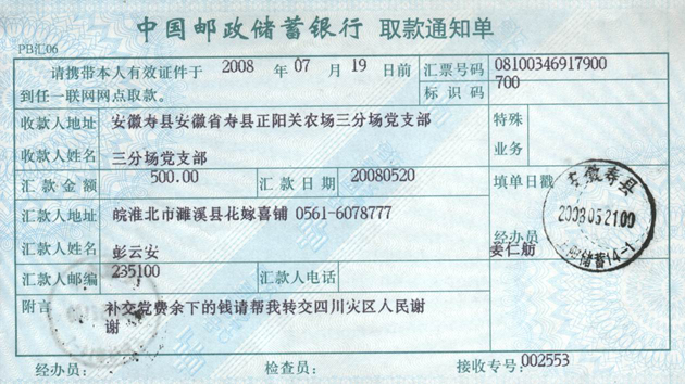 5月21日,安徽农垦正阳关农场三分场党支部收到一张汇款单,汇款金额500元人民币,汇款地址为淮北市濉溪县,汇款人彭云安。汇款人留言:“补交党费余下的钱请帮我转交四川人民灾区 谢谢”。