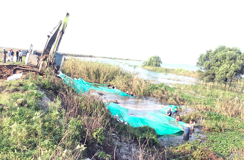 接到险情报告后,农场公司领导及集团公司水利专家吴姓等人第一时间赶赴现场,并立即组织调度防汛抢险突击队员和抢险物资及时到位。到达现场后,发现管涌呈脸盆大小,流砂扩散面积有300平米左右,险情呈进一步加剧趋势,此时因管涌导致堤身下挫0.8米,长度15米左右。经现场研究,及时确定了“外堵”“内导”抢险方案,在堤防临水侧铺设雨布,临时采取堤身取土抢筑戗台,背水侧管涌点修筑围堰,内填砂石反滤料导渗等措施。 关键时刻,四场三队十几名职工跳入湖中铺设雨布、盖堵渗漏。经过300名抢险突击队员和四台挖掘机近3个小时的奋力抢险,险情已得到控制。