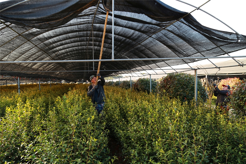工作人员正在茶园里加盖防霜网