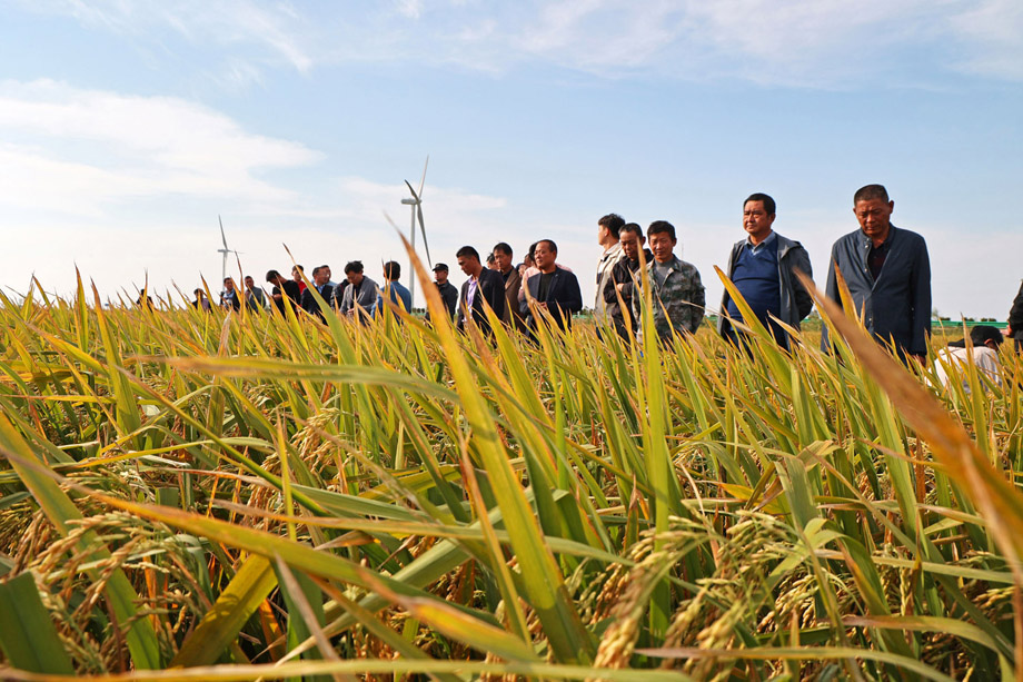 10月10日,华阳河农场公司组织种粮大户、农技人员和社会化服务单位等近百人,到农场统一经营高产示范田观摩成熟期水稻的生长情况。