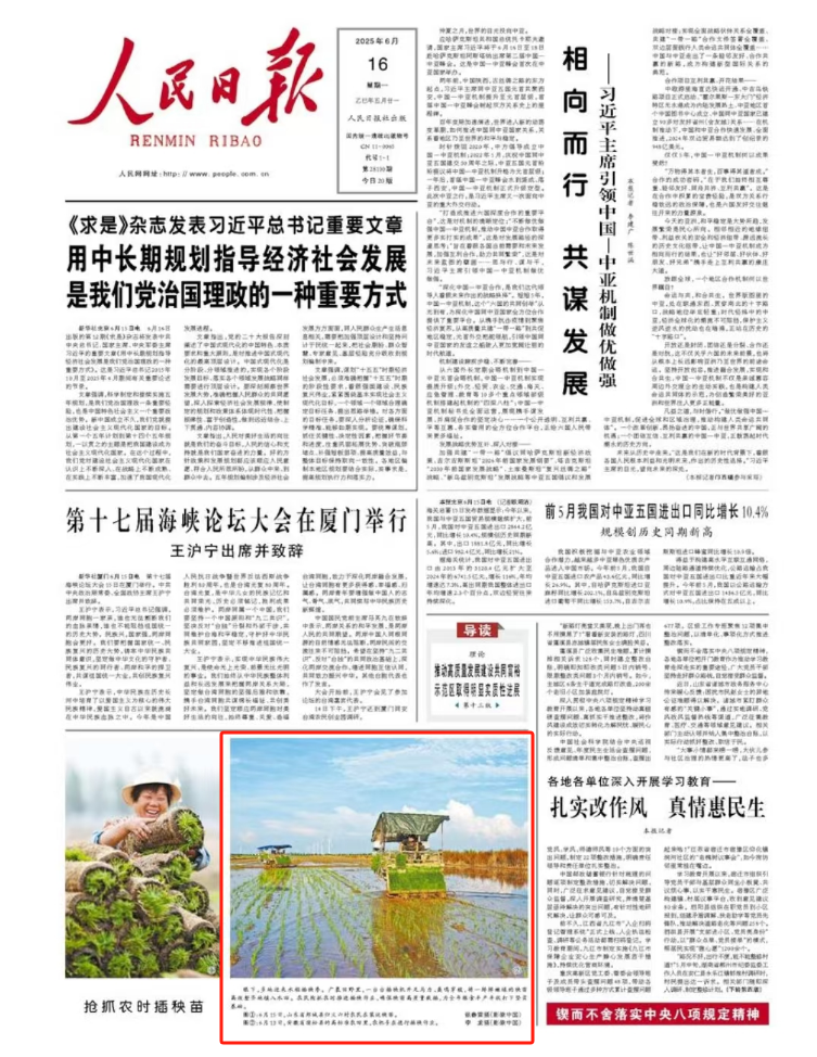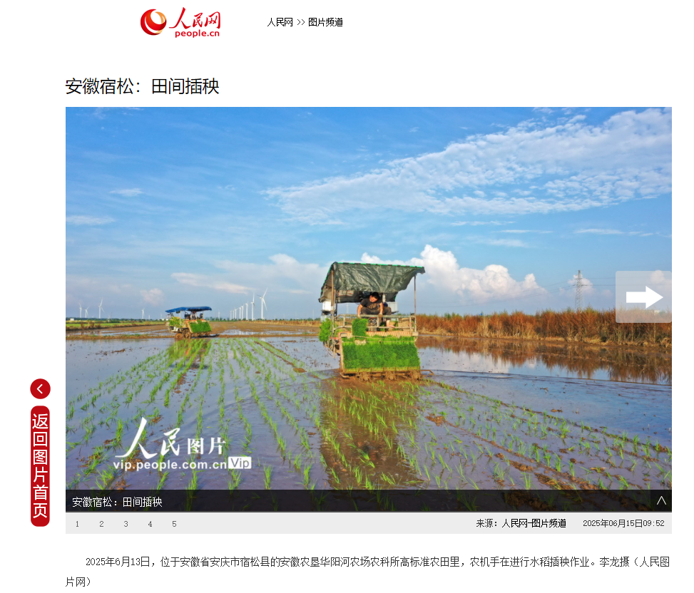 6月15日《人民网》安徽农垦集团和6月16日《人民日报》首版相继报道了安徽农垦华阳河农场夏种机插秧情况。