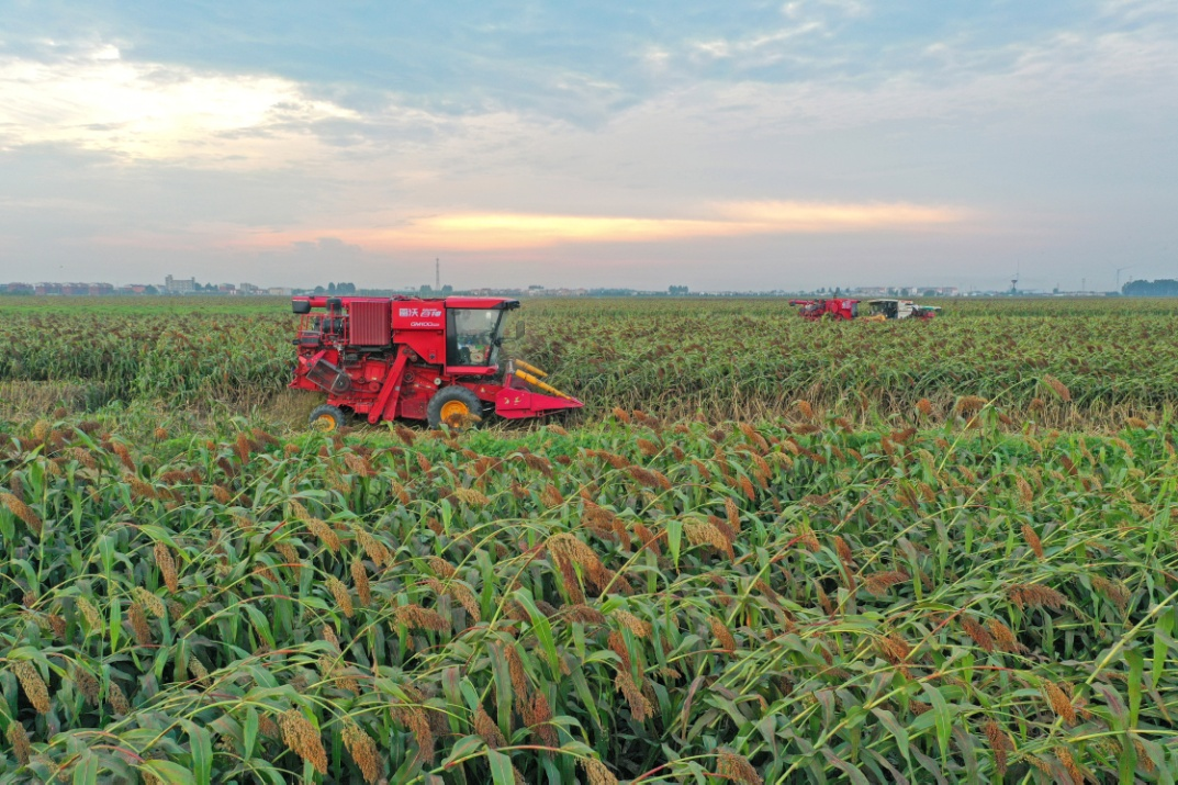华阳河农场高粱收割作业。(李龙 摄)
