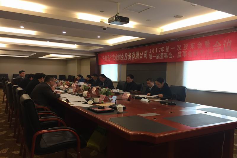 329,安徽农垦集团总会计师、现代农业创投公司董事长高有荣主持召开2017年第一次股东会暨一届董事会、监事会第五次会议,经营层部门以上负责人列席。