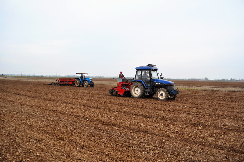 家庭农场职工在小麦原良种繁育基地——安徽农垦潘村湖农场机播小麦。截至1017日,该农场已播种冬小麦2.9万亩,占计划总面积的91%。(安徽日报20131018A2版,杨登宏摄)
