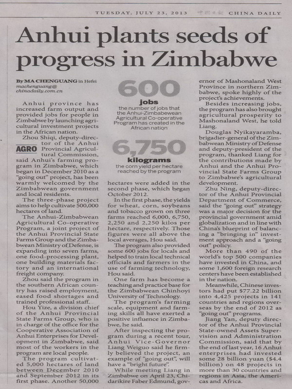 723CHINA  DAILY(中国日报)以 “Anhui plants seeds of progress in Zimbabwe”(安徽省在津巴布韦播下希望之种)为题,报道了安徽农垦发起成立皖企赴津联盟抱团走出去成效,进一步扩大了农垦皖津项目的示范效应。译文如下: