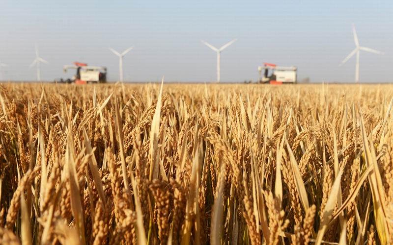 1217,寒冬时节,华阳河农场稻虾田一派金色景象,一台台收割机在田间来回穿梭抢收水稻,田间地里新谷飘香