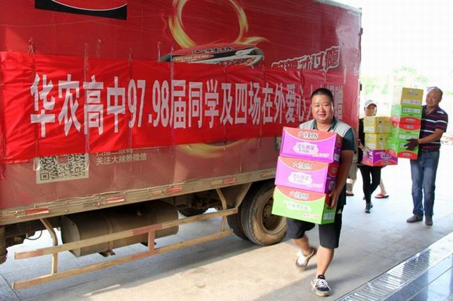 在四分场职工桂志洋发动下,华农高中9798两届同学及四分场爱心人士,建立了名为聚爱心,保家园的微信群,在朋友圈相互转发,让更多人了解农场最新动态,不到两天时间就筹集善款1.6万元,购买200箱矿泉水、300箱方便面和价值3800元的防暑药品,送到了农场防汛办。安徽天溢建筑公司项目经理叶端喜得知家园遭受大灾后,慷慨捐款4万元。另有一些爱心人士还捐赠了3条船。