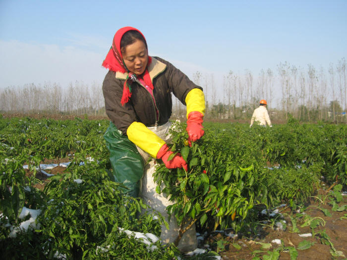 风雪降临菜价扬。1116日的一场大雪,安庆市菜价一路看涨,16日晨农场双河镇包心菜价格窜至3/公斤。农场积极组织菜农抢摘包心菜、大葱各种叶类菜,及时供应农场及安庆市蔬菜市场。16日当天雪花纷飞,菜农们冒着大雪在蔬菜基地忙着摘菜、装车,又在风雪中将蔬菜发往市区。截止18日早上,农场5000亩蔬菜基地共有近百吨叶类菜供应安庆市场,保证了蔬菜货丰价稳,从一定程度上平抑了菜价。