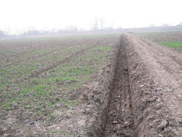 图一为油菜地沟渠施工场面   图二:昔日闲田  今日麦田