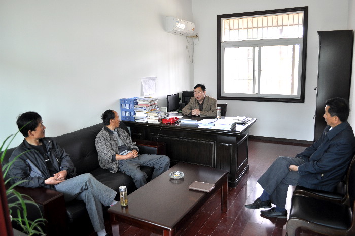 424上午,潘村湖农场党委书记、纪委书记、工会主席林贤传正在与来访的职工交谈。