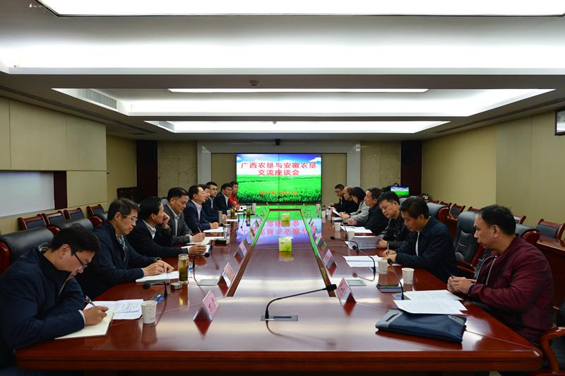 1016-17日,广西农垦集团总经理、工委副书记杨海空率团来安徽垦区考察交流。安徽农垦集团总经理、党委副书记刘超主持召开座谈交流会,副总经理王占廷、总农艺师姚礼发及有关部室负责人参加座谈。