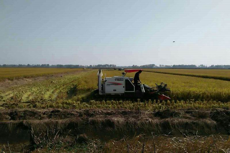 111上午11时,笔者在潘村湖农场二、五分场看到,10多台履带式收割机正在抢收水稻。
