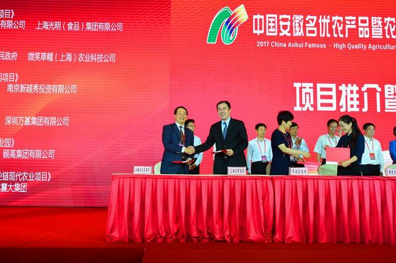 915上午,2017中国安徽名优农产品暨农业产业化交易会重大活动之一的项目推介暨签约仪式如期举行。在主席台12个签约项目中,安徽农垦集团总经理刘超与上海光明集团首席代表王明董签署了“100万头生猪全产业链项目战略合作协议