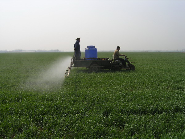 针对今年特殊的暖冬气候,潘村湖农场从2月下旬开始组织家庭农场农场开展了以“控长促壮,以控为主”为主要内容的早春小麦田间管理工作,为2007年度实现“万亩千斤”小麦高产攻关目标奠定了扎实基础。连日来,广大家庭农场职工抓住晴好天气,根据小麦苗情、土壤墒情及病虫草害监测情况,在场农技人员的指导下,将控长、促壮、防病、治虫、除草结合起来集中落实田管技术措施,做到节本高效,一步到位。到3月13日,全场3.2万亩小麦已有90%的地块施行了这种俗称“一炮轰”的田管措施。图为该场一分场职工正在进行机械化药剂喷施作业的场景。(杨登宏)