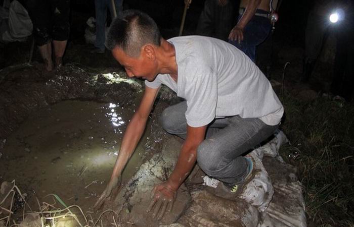 一接到巡堤人员报告,朱权一边火速赶往现场,一边立即上报险情。15分钟后,四场领导带抢险队及时赶到。为确认险情实际状况,大家将原有养水盆内的砂石出清。几分钟后,一个碗口大的管涌不断往外翻滚,浑水夹带着黑砂,竟还有小鱼游出。