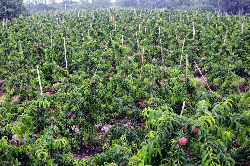 2013年以来,农场引进借力种植大户,引领带动职工种桃,选用早熟丰产的优质良种,密植栽培,科学管理,当年定植,次年挂果,早见效益,目前全场种植良种桃近3000亩,近日千余亩开园采摘上市。走进桃园,红桃满目、缀满枝头,一派诱人的丰收景象,超红、春蜜、春梅、春雪和以色列早红、黄金蜜、满园红等十多个毛桃油桃良种均已成熟,预计产量超百万斤。