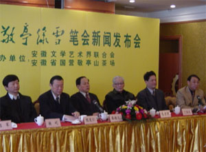 4月4日上午,安徽省文联和安徽省农垦敬亭山茶场 在黄山大厦联合主办的《首届敬亭绿雪笔会新闻发 布会》,省政协副主席秦德文、省委宣传部副部长 陈发仁、省文联名誉主席著名作家鲁彦周、省文联 副主席党组书记杨屹、省农垦集团公司董事长党组 书记丁俊先、省文联书记处书记吴雪、查长发、省 农 垦集团公司副总经理程军等领导出席了会议。由于 全国著名的文艺家的光临,引起了新闻媒体的普遍 关注和轰动,一大批中央和省级媒体的新闻记者40 多人到会采访。