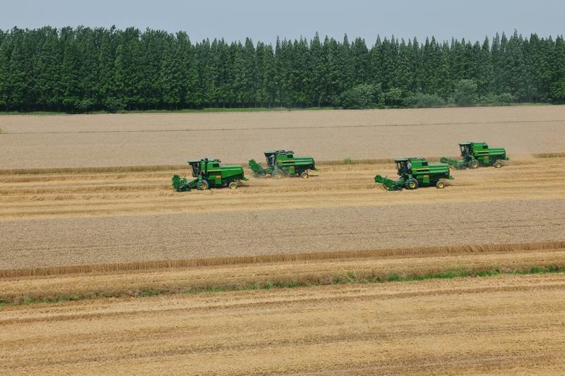 当前三夏生产进入高潮,全国小麦机收正由南向北快速推进。为确保粮食颗粒归仓,日前,安徽农垦抢收保种,全系统已投入大型联合收割机械、拖拉机等农机具5000台套。图为寿西湖农场农机会战现场。(经济日报201661311版,鲍广云摄)