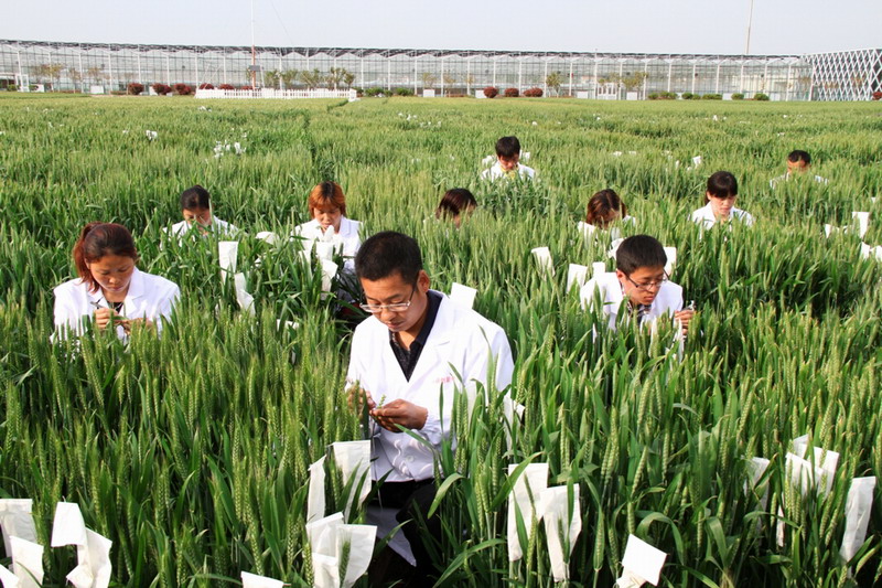 421,安徽农垦龙亢农场现代农业科技园区里小麦杂交育种全面开展,副场长王永玖正带领农业科研人员做小麦杂交授粉。今年,农场计划做小麦杂交组合2500多个。