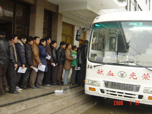 1月17日上午8点钟,当采血车到达农场后,人们冒 着寒风冷雨,不约而同赶来,献血的场面感人至 深。在验血现场,大家踊跃填表,争相验血;采验 车前,长龙般的献血队伍从早上排到中午,络绎不 绝。献血的人群中有场领导、各单位领导干部、党 员、学校老师、医院医护人员、普通职工、群众, 有的是夫妻、兄弟、姐妹双双结伴而来,还有不少 人已是第二次、第三次无偿献血……。据统计,这 次全场共有122人参加了献血活动,共献血24400毫 升。 (夏庆芳)