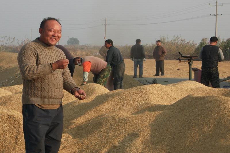 晒场是展示丰收成果的现场——稻谷堆成小山似的,犹如金山银山。天刚亮,两辆汽车停在场边收购稻谷,工作人员一边测水分,一边过磅上车。笔者饶有兴趣地问种植户,今年产量咋样?老张磕着稻籽,露出两颗门牙,不无得意地说:轻巧说每亩有1200多斤,价格也很可观。大家都笑了,这笑声发自职工的内心,这笑声流露出他们对党的富民政策真诚地感激。