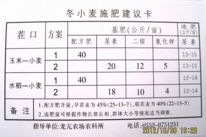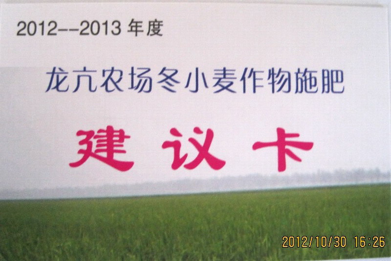 为落实安徽农垦科技促进年活动措施,做好全场秋种重点科技推广工作,连日来,龙亢农场农科所根据测土配方施肥的多年检测结果,结合小麦高产创建工作,针对各分场土壤养分含量情况,印制了《2012-2013年度龙亢农场冬小麦作物施肥建议卡》1000余份,并及时发放到职工家庭农场。