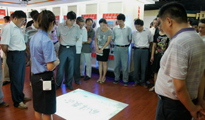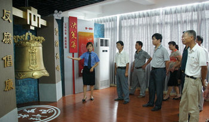 室内展厅分为决策篇、预防篇和警示篇。从党和国家领导人提出的两个务必到“反腐败要同党的纯洁性教育结合起来,对于违法违纪行为要依法查处,绝不姑息”,体现了中国高层决策上对反腐倡廉工作的高度重视和坚定决心。展示墙上悬挂着《中国共产党廉洁从政准则》等法律法规,以及古人廉洁为官的典型事迹,其中,东汉太尉杨震天知神知我知子知的典源,彰显了为官者的原则、道德与良知。警示篇中,一幅幅警示图片和一个个真实案例,形象生动地阐释了十种新形式受贿案例,以及近年来各级官员因贪污受贿而身陷囹圄的重大案件,再现了那些曾经位高权重的高官和所谓的人民公仆是如何被金钱美色冲昏头脑、最终沦为阶下囚的真实过程,触动着在场每个人的心灵。通过复原服刑人员家属探监的场景,让全体党员干部感受到了家庭责任和腐败危害。警示展览资料与艺术品创作、多媒体演绎、声光电等现代展陈手段相配合,生动形象、图文并茂,展示了职务犯罪的严重危害,震撼了全体党员干部的心灵。