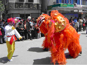 参加此次踩街表演的龙亢农场花鼓灯艺术团共有46 名演员,平均年龄在68岁,在踩街表演中,他们用 娴熟的技艺向沿途万名观众表演了舞狮子、游旱船 等20多个精彩节目,精彩的演出不时博得了围观群 众的阵阵掌声。(图/王戴群 文/李峰)
