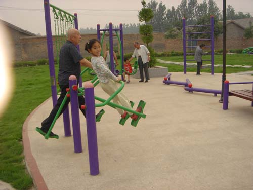 六月的砀山果园场一片碧绿,浓绿掩映下的休闲广场身姿丰润,仪态大方。亭台楼阁亭亭玉立,高雅端庄;小桥溪水,交相辉映,小桥精巧别致,溪水清澈见底,水底的鹅卵石栩栩如生;假山奇石嶙峋突兀,千姿百态;健身器错落有致,各式多样,鹅卵石铺设的小道在翠绿的草坪上弯曲回转,构成了一幅和谐优雅的风景图。