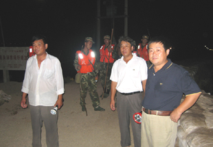 夜晚,堤坝上一盏盏白炽灯连成一线,尽管因电压低有所灰暗,但还是极大地方便了行走。电筒射出的光束到处可见,三五成阵的巡堤查险人员一批接一批,有农场职工,有武警官兵,他们呈一字排开,沿着堤顶、堤肩、堤身和堤脚仔细检查。有时他们的脸几乎贴着地面,是那么的谨小和慎微,我想,任何一处哪怕是一点点的隐患也都会被及时发现。
