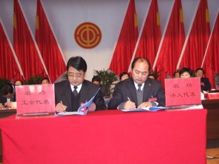 龙亢农场法人代表、场长、党委书记杨俊宇与龙亢农场工会代表、工会主席、党委副书记张建民现场签订了《龙亢农场集体合同》。