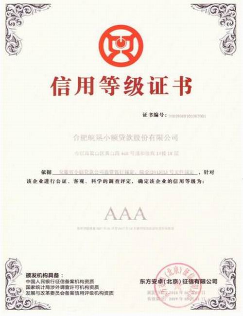 本次监管评级依据《安徽省小额贷款公司监管暂行规定》、省政府金融办《关于印发安徽省小额贷款公司评级管理暂行办法的通知》等文件规定,由中国五大评级机构之一的东方安卓(北京)征信有限公司组织开展。