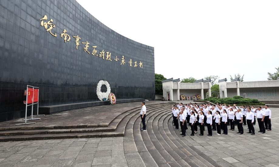 在泾县县委党校,授课老师以《传承红色基因  弘扬新四军精神》为主题,讲授了新四军的由来、新四军的光辉历史和新四军精神。大家共同瞻仰了皖南事变烈士陵园、新四军军部旧址和王稼祥故居,深入学习了革命先烈的丰功伟绩和历史贡献。在皖南事变烈士陵园前,王西享带领大家向皖南事变烈士纪念碑敬献了花篮,并在皖南事变烈士陵园广场带领大家重温入党誓词。