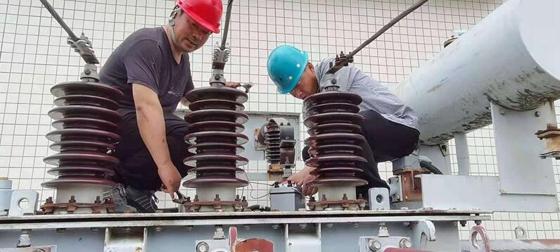图为排灌总站党员突击队抢修变压器保供电