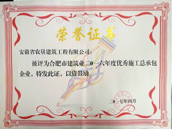 近日,垦建公司荣膺合肥市建筑业2016年度优秀施工总承包企业称号。这是垦建公司连续第四年获此殊荣。
