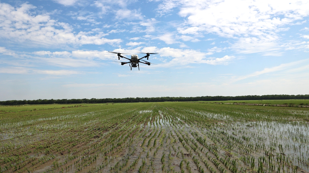 7月5日,龙亢农场公司农业二场,无人机正在追施分蘖肥。 周文娟 摄