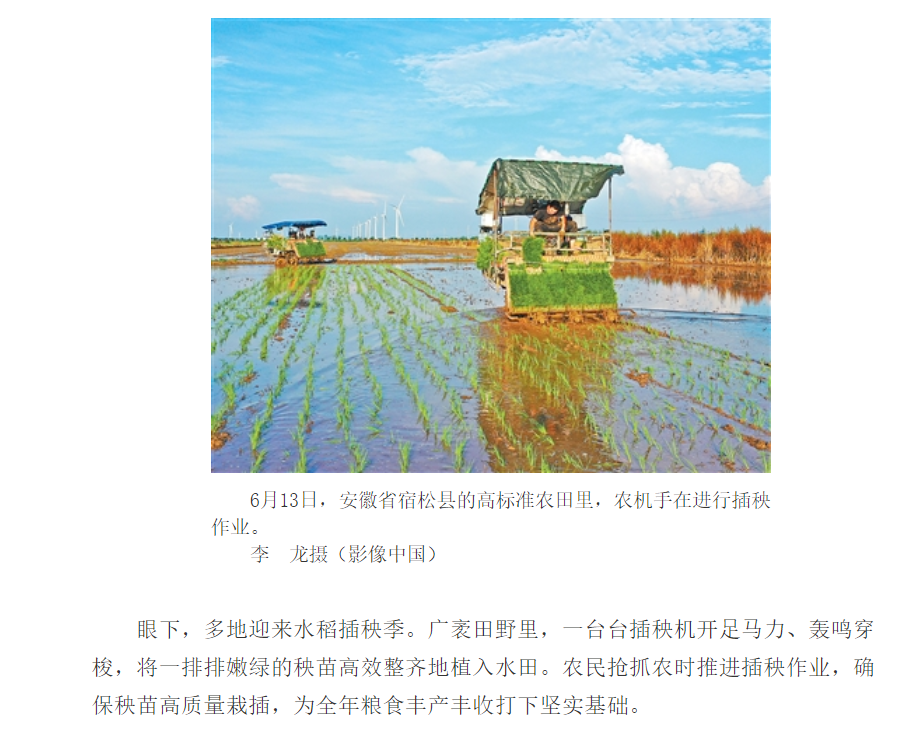 6月15日《人民网》安徽农垦集团和6月16日《人民日报》首版相继报道了安徽农垦华阳河农场夏种机插秧情况。