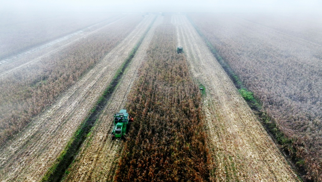 华阳河农场高粱收割作业。(李龙 摄)