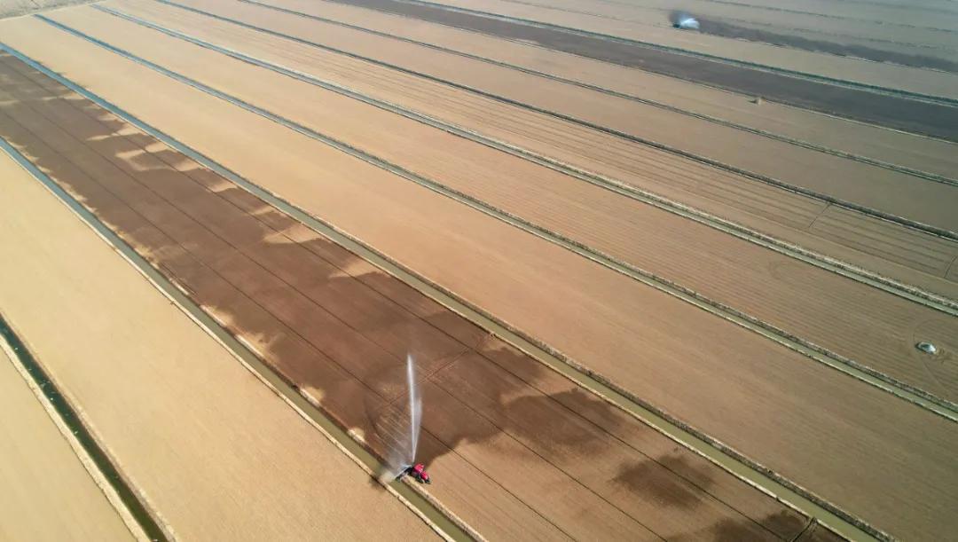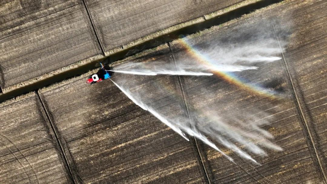 华阳河农场针对部分晚稻茬小麦土壤墒情不足的情况,迅速组织喷灌抗旱,实施精准补水,确保稻茬麦齐苗越冬。(李龙)