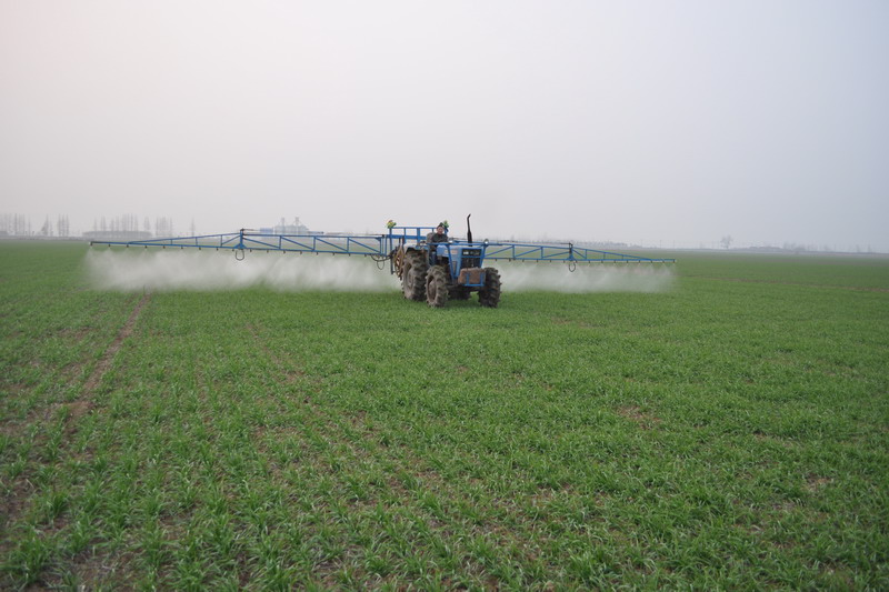 126,在全省最大的小麦良种繁育基地——安徽农垦潘村湖农场,家庭农场职工正在进行化除喷肥作业。眼下沿淮地区冬小麦进入分蘖期,肥水需求旺盛,该农场对3.2万亩小麦种子田全面开展化除喷肥作业,促进小麦壮苗越冬。(安徽日报2013129头版,杨登宏摄)