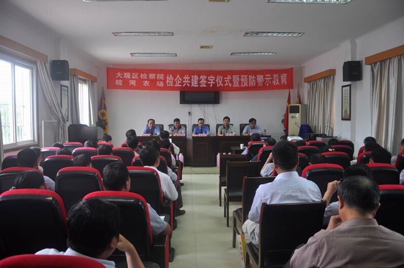 618,皖河农场党委与安庆市大观区检察院联合举行检企共建预防职务犯罪平台签约仪式暨预防警示教育活动。区检察院院长吴才广、副院长何天锡和场领导赵军、胡兴兵、汪丙来、徐和兴、徐英晴、占美能出席,农场各部门单位党政负责人、会计人员参会。
