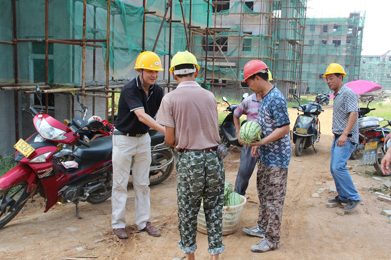 何宗仁代表场党委对建筑工人坚守保障房建设一线表示感谢,并督促施工单位本着以人为本的宗旨,合理安排工作和休息时间,落实安全生产措施,做好高温施工服务和工人饮食卫生等后勤保障,确保工人兄弟身体健康,在炎夏中得到一份清凉。