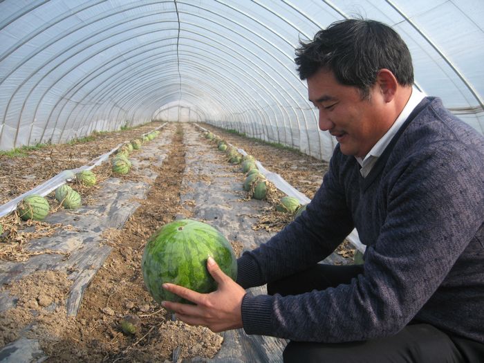 近日,省农垦皖河农场蔬菜专业户李凯正在温室大棚里采摘西瓜。李凯这几年坚持打时间差种反季节西瓜,获得了较好收成。今年秋季,李凯在大棚里种上了50多亩无籽西瓜,受11月中旬强降雪天气影响,部分西瓜遭受冻害,但西瓜亩产仍达到2500公斤左右,按目前市场价每亩0.9元算,亩效益达4000元左右。他种的无籽西瓜俏销城市饭店,成为餐桌新宠,在寒冬里为市民带来“抱着火炉吃西瓜”的另类感受。