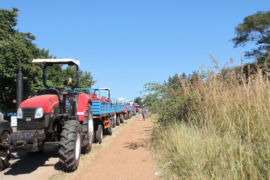 56,安徽农垦皖津公司第一批农机设备启程奔赴皖津SISI农场,早晨858分,车队开始启运,一辆辆满载生产设备的拖拉机鳞次栉比,浩浩荡荡的运行在温西公路(温亚尼~SISI农场)之上,引来了无数津国路人的驻足观看,也引来了来往车辆的鸣笛致意。