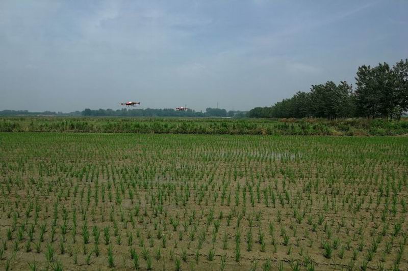 大圹圩无人机植保队开进荒草圩